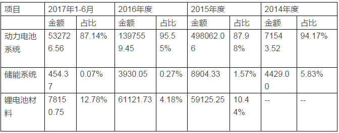 動力電池系統銷售是其最主要的收入來源。招股書顯示,2014年、2015年、2016年和2017年1~6月,公司動力電池系統銷售收入分別7.15億元、49.81億元、139.76億元和53.27億元,占主營業務收入的比例分別為94.17%、87.98%、95.55%和87.14%。